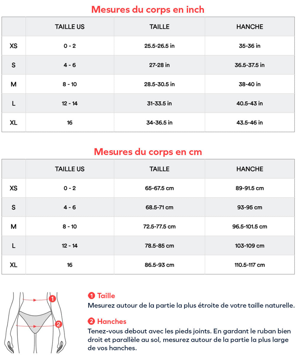 - Tailles disponibles : S/M (34 à 38), L/XL (40 à 44), XXL (46 à 52).
